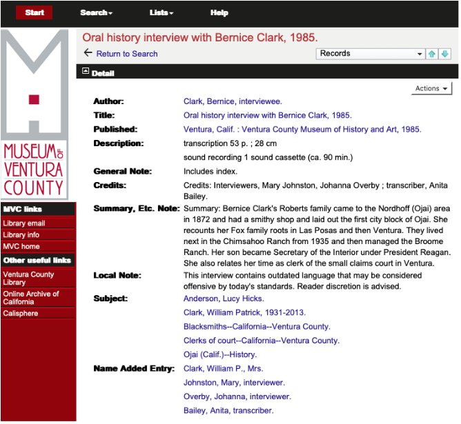 This project funded the digitization of nearly 400 oral histories which the museum had started collecting during the 1950’s. They tell the story of Ventura County from the late 1800’s through the present. The transcribed histories are summarized and searchable by keyword and freely accessed via their website. Important topics include the development of medicine in the county, the St Francis Dam disaster of 1928, the evolution of agriculture, the experiences of minority residents, and the history of the petroleum industry.